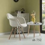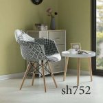 صندلی sh752 با پایه های چوب راش است که توسط قیدهای فلزی بهم متصل شده اند و قسمت نشیمن از جنس فایبر گلاس است با روکش فوم و نهایتا روکش پارچه در طرحها و رنگهای مختلف